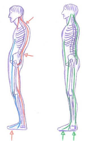 Diese Körperhaltung treffe ich immer wieder an in meiner Praxis. Die roten Pfeile zeigen die klassischen Schmerzorte. Der Ursprung dieser Rückenschmerzen liegt aber bei den allermeisten Personen bei den Füssen. Grund: Mehr Gewicht auf den Zehen und weniger auf den Fersen. Dadurch wird das Becken nach vorne verschoben. Die Wirbelsäule muss die Körperhaltung nach hinten ausgleichen. Rückenschmerzen entstehen, weil die Rückenmuskeln unter Dauerbelastung arbeiten muss, weil man sonst nach vorne kippen würde.